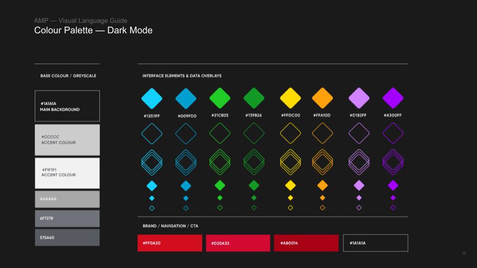 The principal work for AMP started with designing the brand and visual language guidelines. This was a collaborative process that involved several workshops with key stakeholders to understand and best represent the product, proposition, and ambition. Over the course of seven weekly sprints, a visual language evolved which enabled us to concept, create and visualise different ways of accessing AMP data to inform and inspire the UI and future development of the platform.
